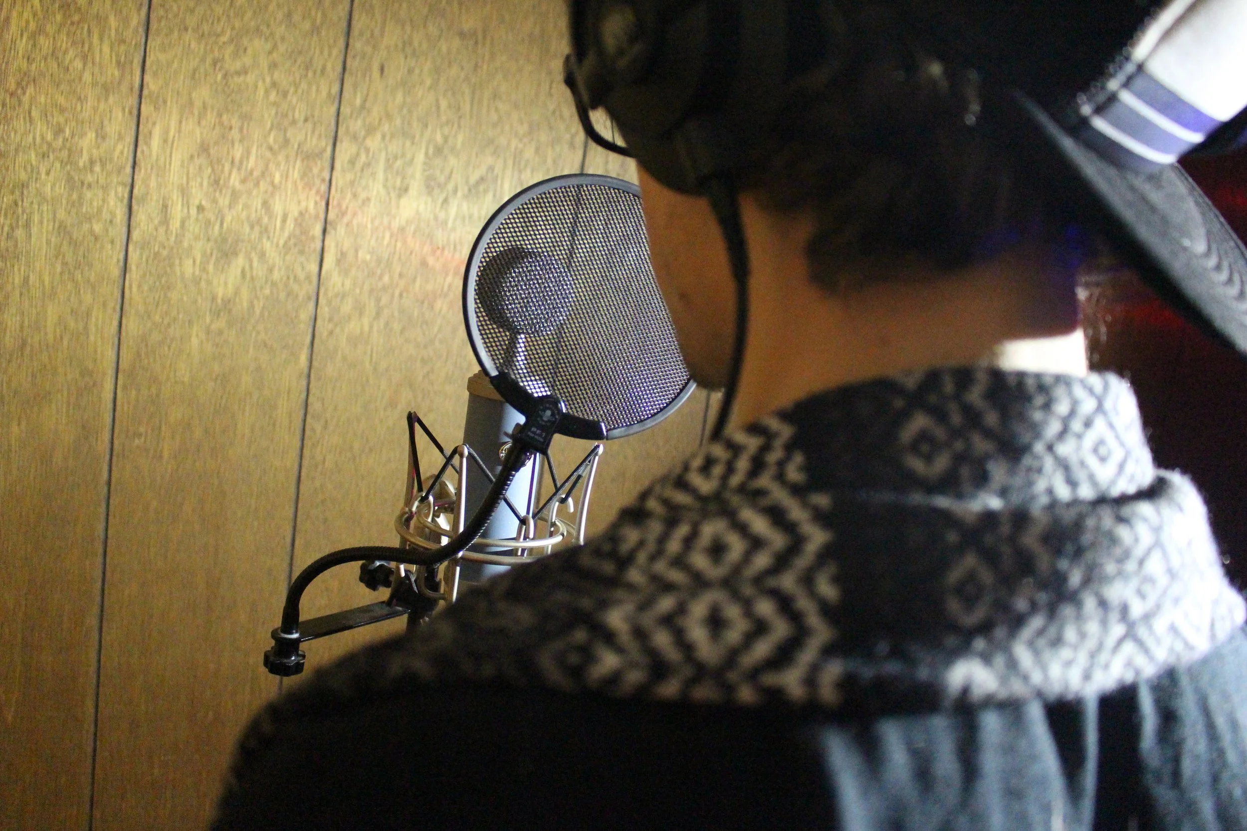 Person wearing headphones and a patterned scarf in front of a microphone with a pop filter, recording in a studio.