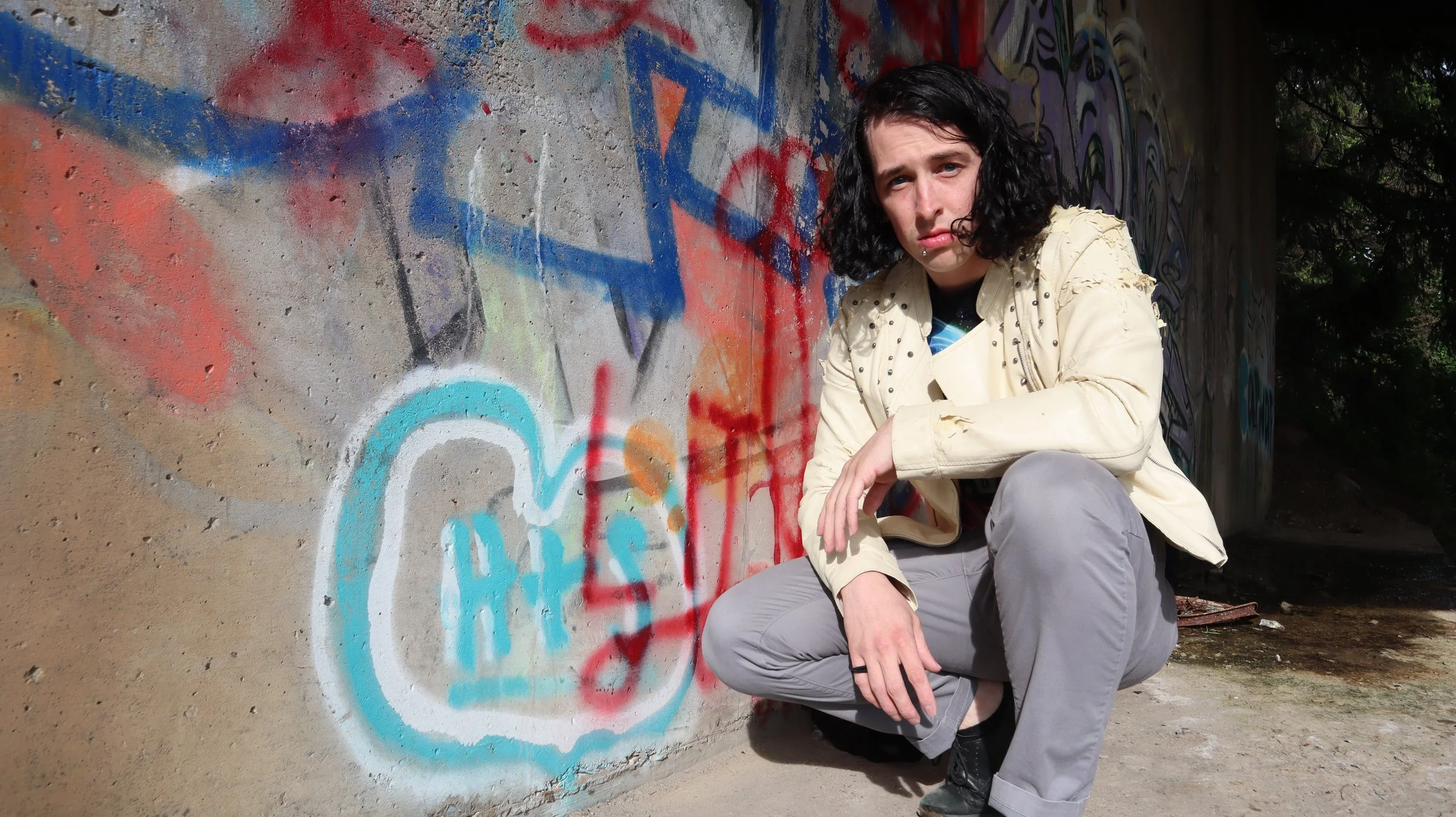 Person with dark curly hair and lip piercing wearing a light-colored jacket, squatting next to a graffiti-covered concrete wall outdoors.