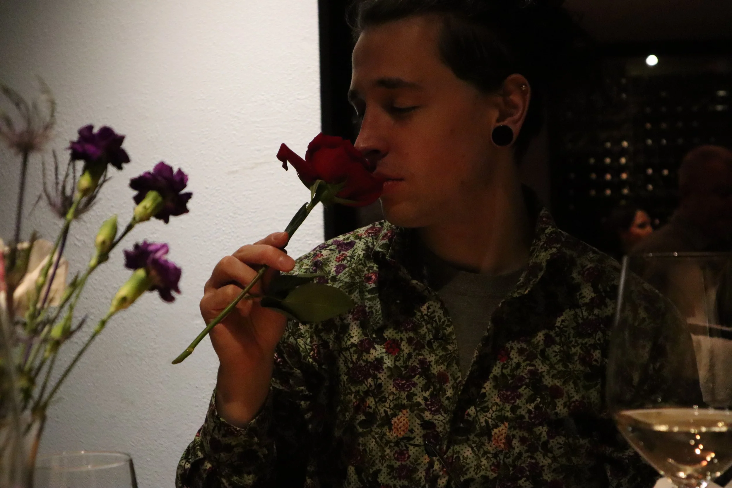 Person smelling a red rose at a dining table with flowers and a wine glass.