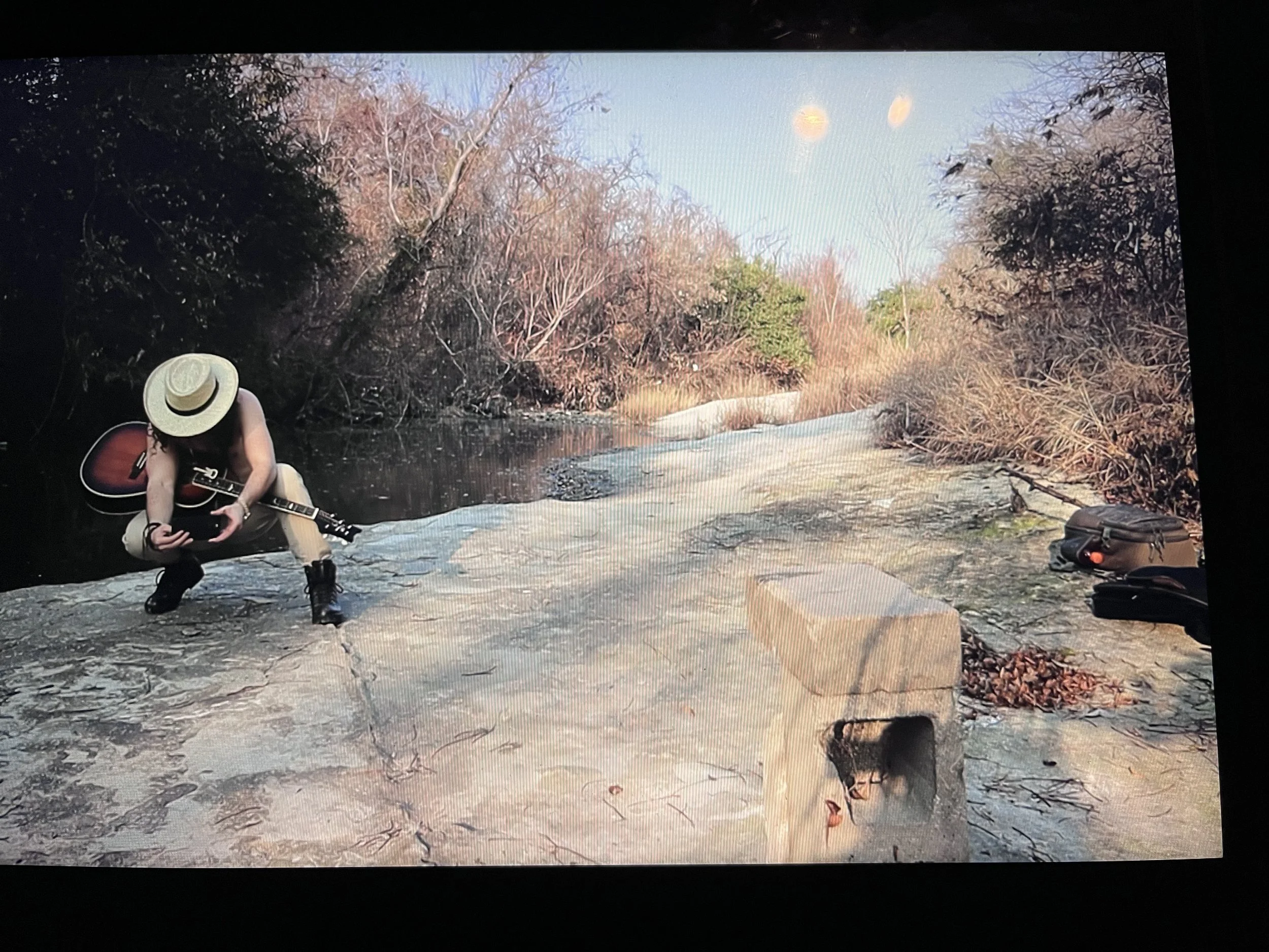 A person wearing a straw hat crouches on a rocky surface near a small river, holding a guitar. The surroundings include leafless trees and dry grass, indicating a cold or dry season. A bag and a stone pillar with an opening are visible on the right s